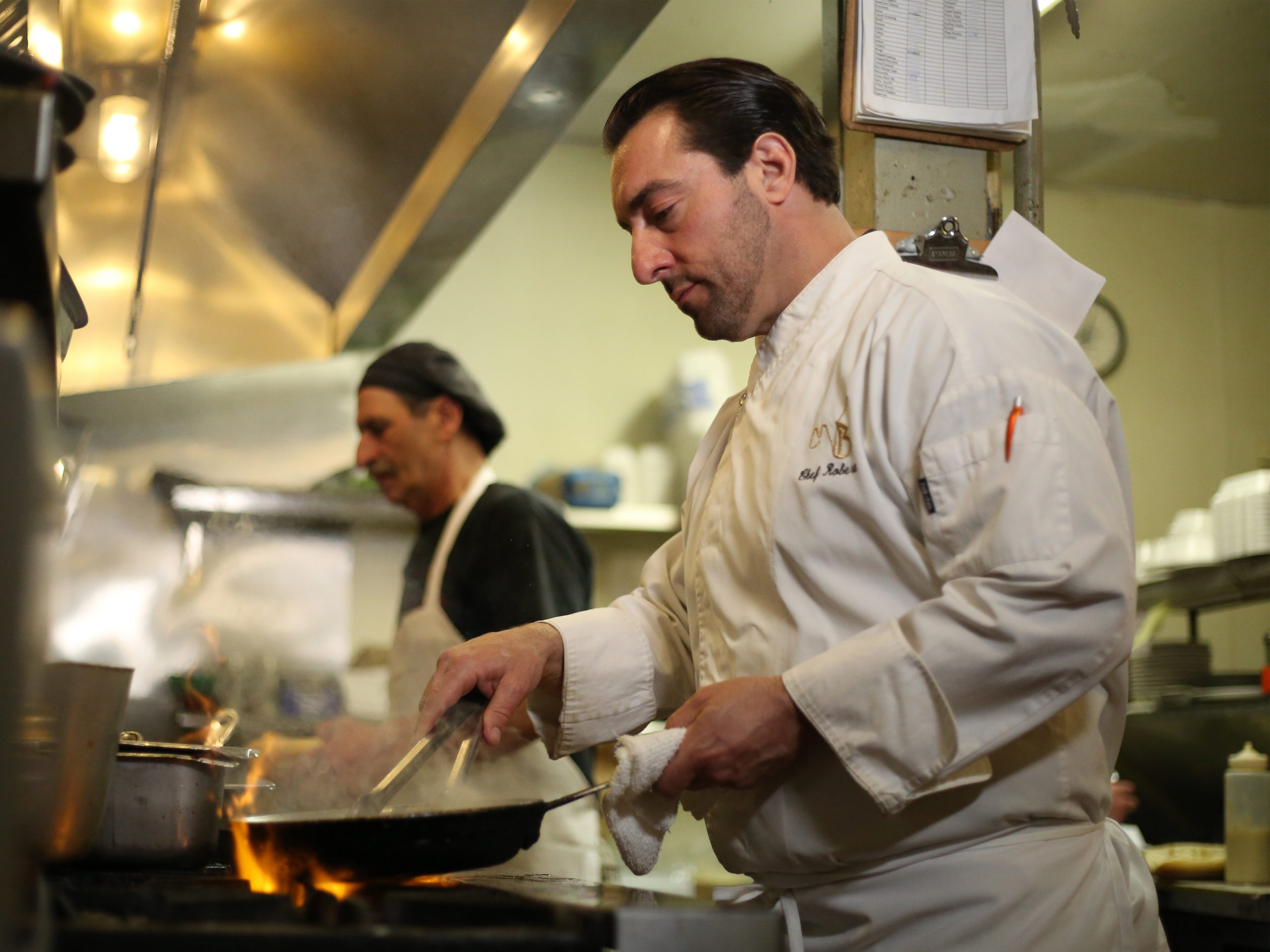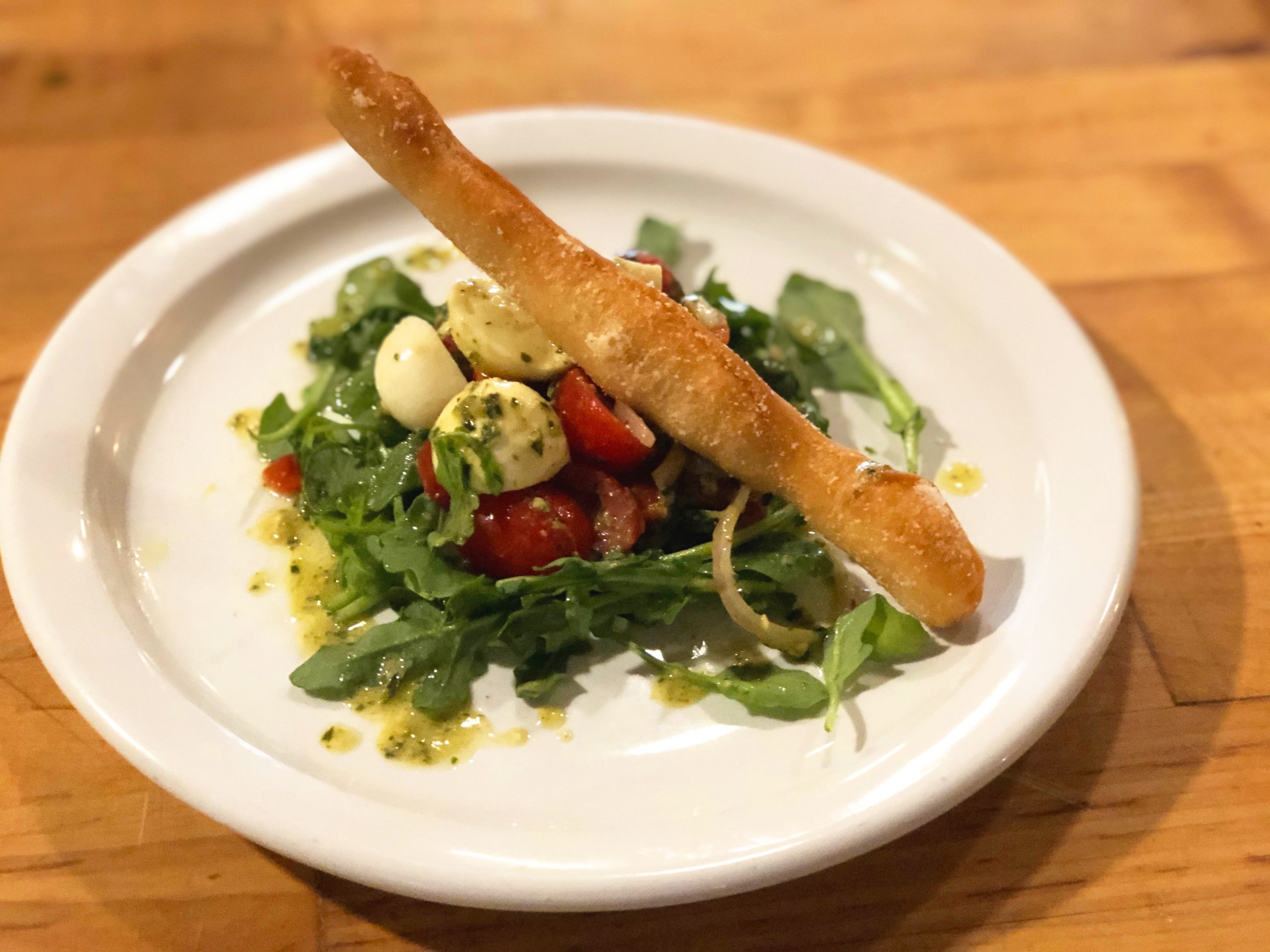 Jersey Tomato-Mozzarella Caprese Salad, with roasted peppers, Jersey arugula, Chef’s Garden organic pesto vinaigrette, garlic zeppoli bread sticks