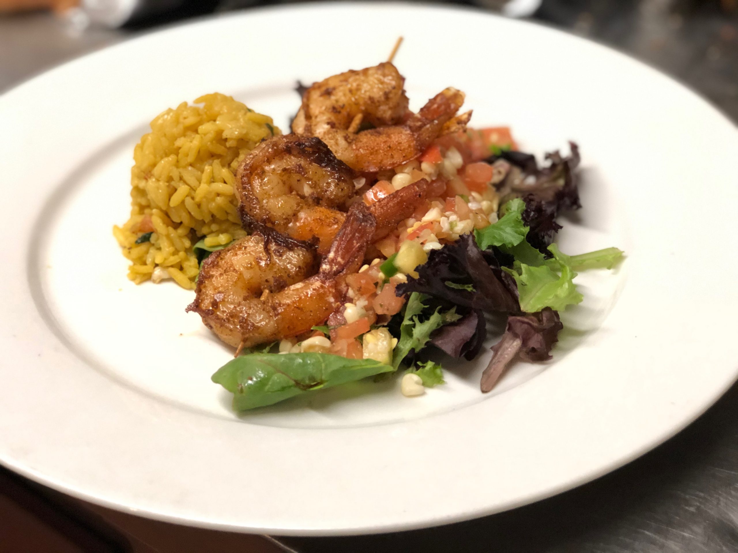 Cajun Grilled Colossal Shrimp, tomato-sweet corn salsa, Mexican rice pilaf, creme fraische