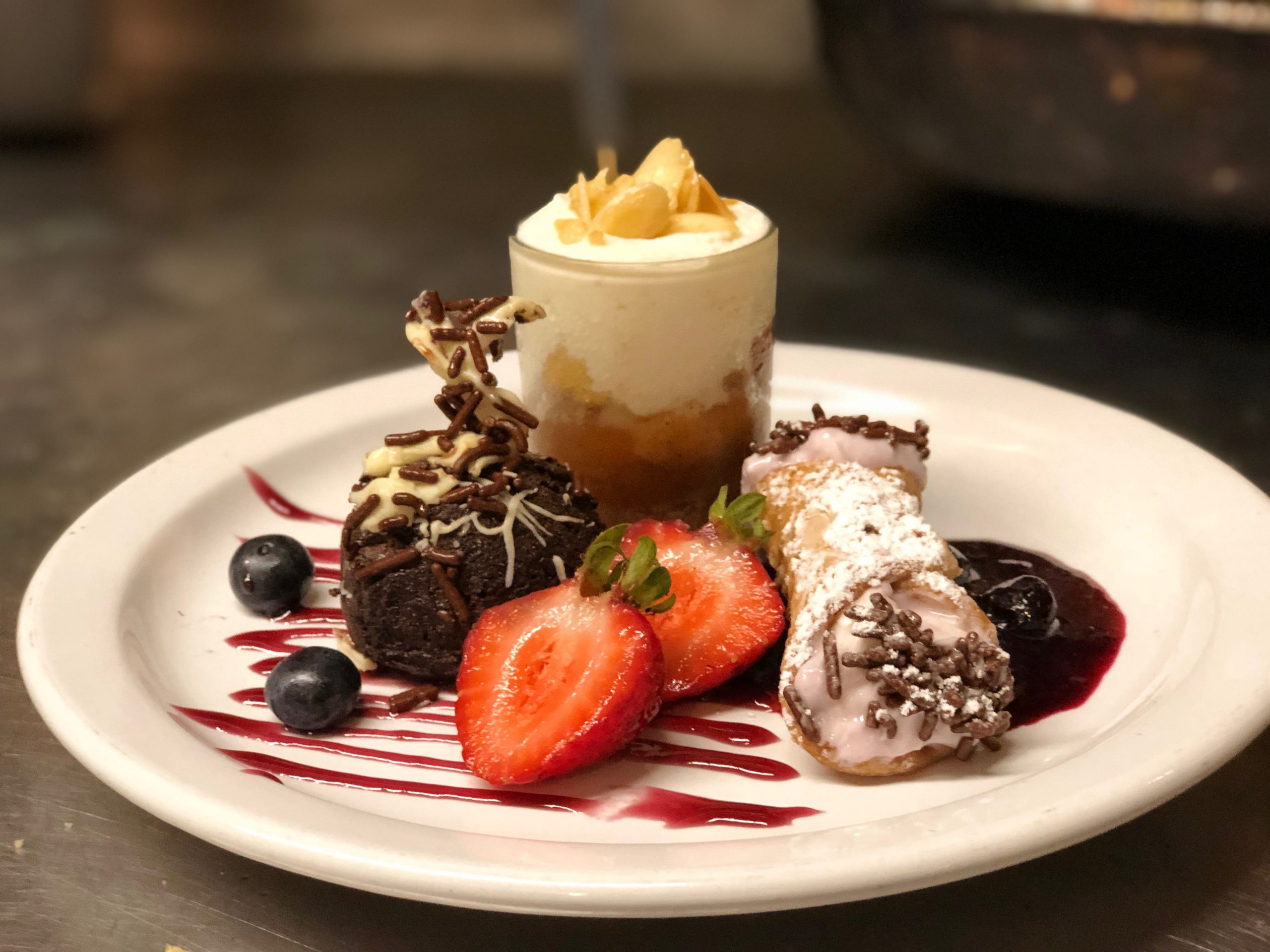 Jersey Peach Trifle Shooter, Jersey Blueberry Bread Pudding, Bacio Dark Chocolate Obsession